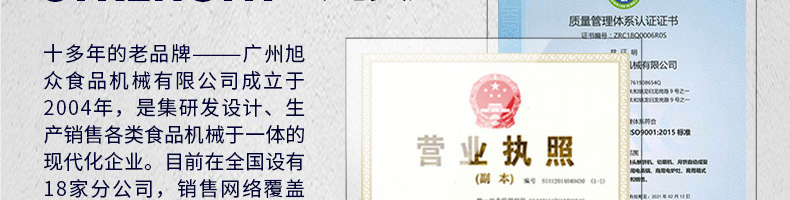 廣州旭眾食品機(jī)械有限公司是一家集科研開(kāi)發(fā),生產(chǎn)設(shè)計(jì),營(yíng)銷(xiāo)服務(wù)為一體的現(xiàn)代化生產(chǎn)企業(yè)?,F(xiàn)代化生產(chǎn)車(chē)間,精湛制造技術(shù),所產(chǎn)機(jī)械歷經(jīng)市場(chǎng)重重考驗(yàn),不斷贏得海內(nèi)外客戶的贊譽(yù)。