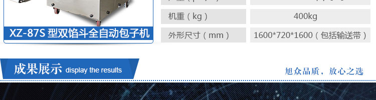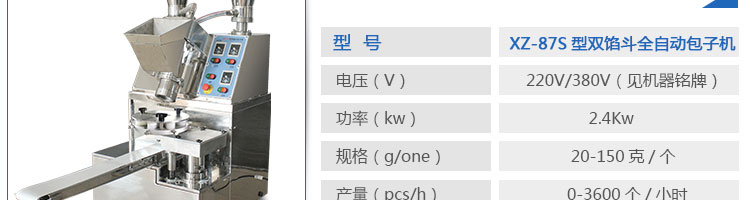 XZ-87S型雙餡斗全自動(dòng)包子機(jī),可生產(chǎn)各種肉包、肉菜包、菜包、小籠包、湯包、水晶包、圓饅頭、奶黃包、豆沙包、叉燒包、南瓜餅等幾十種包餡制品。適用于賓館、飯店、學(xué)校、機(jī)關(guān)企業(yè)食堂、饅頭或包子加工廠、早餐工程店及速凍食品廠等單位??蓾M足不同客戶群體。免費(fèi)提供工藝技術(shù)。免費(fèi)上門(mén)培訓(xùn)指導(dǎo)安裝。