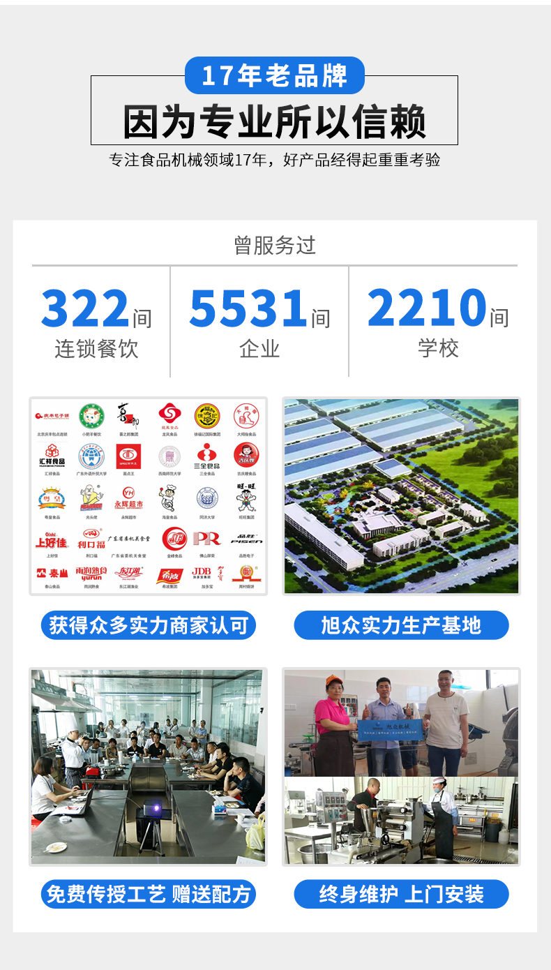 廣州旭眾食品機(jī)械有限公司是一家集科研開發(fā),生產(chǎn)設(shè)計(jì),營(yíng)銷服務(wù)為一體的現(xiàn)代化生產(chǎn)企業(yè)。現(xiàn)代化生產(chǎn)車間,精湛制造技術(shù),所產(chǎn)機(jī)械歷經(jīng)市場(chǎng)重重考驗(yàn),不斷贏得海內(nèi)外客戶的贊譽(yù)。