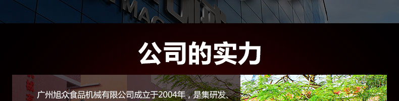 廣州旭眾食品機(jī)械有限公司是一家集科研開(kāi)發(fā),生產(chǎn)設(shè)計(jì),營(yíng)銷服務(wù)為一體的現(xiàn)代化生產(chǎn)企業(yè)。現(xiàn)代化生產(chǎn)車間,精湛制造技術(shù),所產(chǎn)機(jī)械歷經(jīng)市場(chǎng)重重考驗(yàn),不斷贏得海內(nèi)外客戶的贊譽(yù)。
