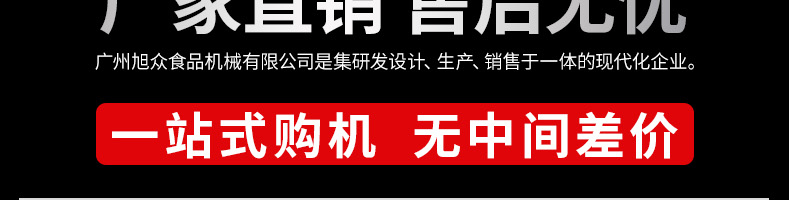 廣州旭眾食品機械有限公司是一家集科研開發(fā),生產(chǎn)設(shè)計,營銷服務(wù)為一體的現(xiàn)代化生產(chǎn)企業(yè)?,F(xiàn)代化生產(chǎn)車間,精湛制造技術(shù),所產(chǎn)機械歷經(jīng)市場重重考驗,不斷贏得海內(nèi)外客戶的贊譽。
