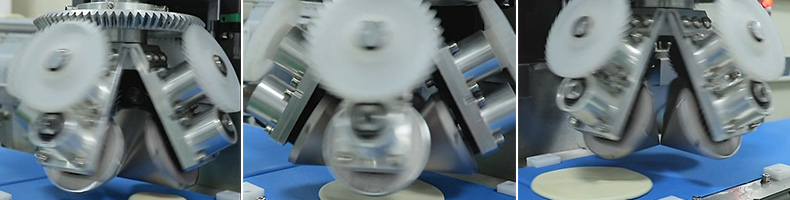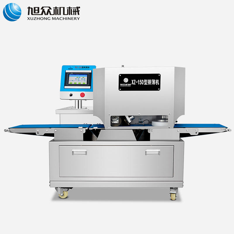 XZ-150型搟薄機(jī),為一種對(duì)面團(tuán)可進(jìn)行氣動(dòng)拍餅或仿手工搟薄的設(shè)備,可根據(jù)用戶需要對(duì)面團(tuán)的直徑、厚度進(jìn)行調(diào)整并將面團(tuán)按照設(shè)定的規(guī)格進(jìn)行搓圓摔搟薄。