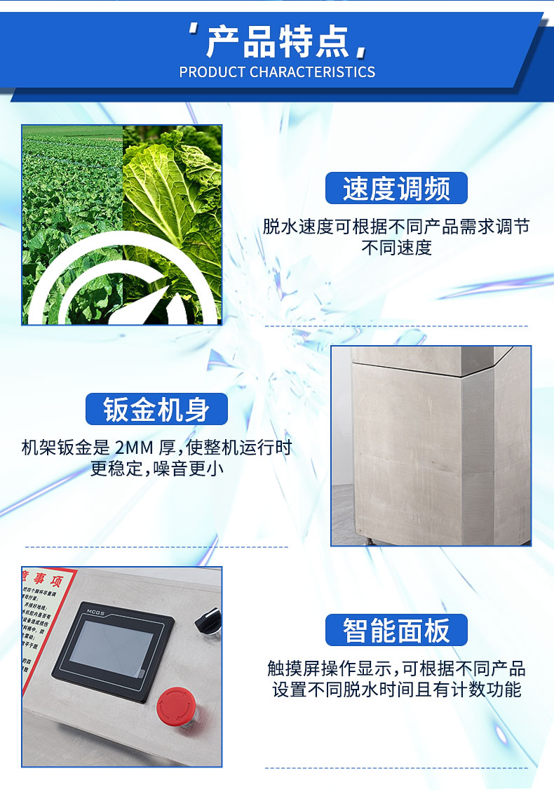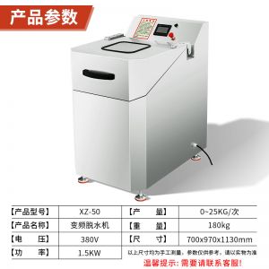 XZ-50型脫水機(jī),蔬菜脫水食品甩干,變頻控制、方便快捷。速度調(diào)頻,脫水速度可根據(jù)不同產(chǎn)品需求調(diào)節(jié)不同速度。鈑金機(jī)身,機(jī)架鈑金是 2MM 厚,使整機(jī)運行時更穩(wěn)定,噪音更小。