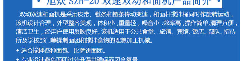 SZH-20型雙速雙動和面機(jī),本機(jī)適合攪拌各種面包、包子、饅頭、湯圓、披薩餅面團(tuán),專業(yè)設(shè)計避免面團(tuán)過分升溫并確保面團(tuán)含氧量。過載、缺相保護(hù)裝置,防護(hù)罩安全連動裝置。