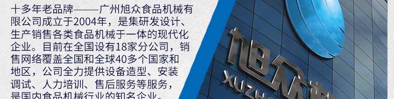 廣州旭眾食品機(jī)械有限公司是一家集科研開發(fā),生產(chǎn)設(shè)計(jì),營銷服務(wù)為一體的現(xiàn)代化生產(chǎn)企業(yè)?,F(xiàn)代化生產(chǎn)車間,精湛制造技術(shù),所產(chǎn)機(jī)械歷經(jīng)市場重重考驗(yàn),不斷贏得海內(nèi)外客戶的贊譽(yù)。