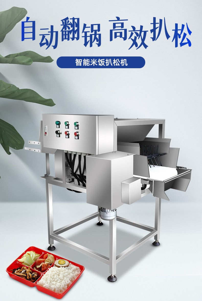 智能米飯扒松機-翻轉扒松機,主要結構:由不銹鋼機架、翻鍋機構、扒松機構輸送機構和電氣自動系統(tǒng)等組成。適用對象:主要用于中央廚房、團膳、企事業(yè)單位食堂等