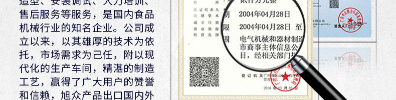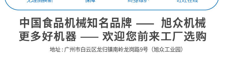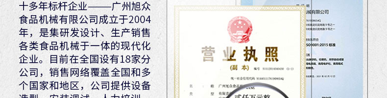 廣州旭眾食品機(jī)械有限公司是一家集科研開(kāi)發(fā),生產(chǎn)設(shè)計(jì),營(yíng)銷服務(wù)為一體的現(xiàn)代化生產(chǎn)企業(yè)?,F(xiàn)代化生產(chǎn)車間,精湛制造技術(shù),所產(chǎn)機(jī)械歷經(jīng)市場(chǎng)重重考驗(yàn),不斷贏得海內(nèi)外客戶的贊譽(yù)。