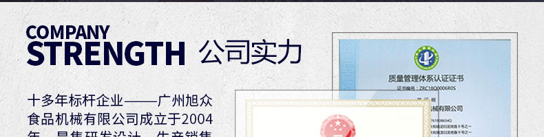廣州旭眾食品機(jī)械有限公司是一家集科研開發(fā),生產(chǎn)設(shè)計(jì),營銷服務(wù)為一體的現(xiàn)代化生產(chǎn)企業(yè)?,F(xiàn)代化生產(chǎn)車間,精湛制造技術(shù),所產(chǎn)機(jī)械歷經(jīng)市場(chǎng)重重考驗(yàn),不斷贏得海內(nèi)外客戶的贊譽(yù)。