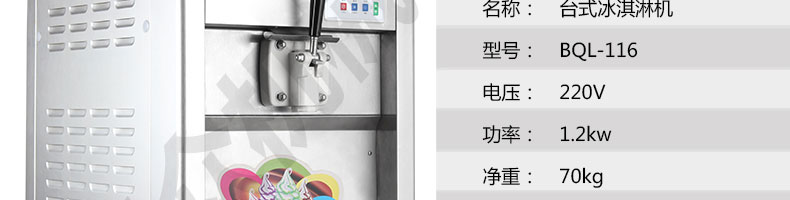 BQL-116臺(tái)式冰淇淋機(jī),●選用國(guó)際名牌成熟制冷配套件和高效壓縮機(jī),融合旭眾精湛工藝輔以嚴(yán)格的質(zhì)量控制流程,使產(chǎn)品整體性能及品質(zhì)得以全面提升。●采用全數(shù)字電腦控制系統(tǒng),選用名牌優(yōu)質(zhì)電器元件,先進(jìn)的生產(chǎn)工藝,故障診斷,軟硬任意調(diào)制,自動(dòng)修復(fù)功能,安全精確,可靠性更高?!駥I(yè)成熟制冷系統(tǒng)設(shè)計(jì),選用世界名牌大功率專用壓縮機(jī),大大縮短冰淇淋成型時(shí)間,相同時(shí)間內(nèi)冰淇淋產(chǎn)量大幅度增加,使您生意火爆時(shí)依然得心應(yīng)手,為您創(chuàng)造財(cái)富?!癜踩椒€(wěn)的機(jī)械攪拌系統(tǒng),噪音更低、振動(dòng)更小,使整機(jī)運(yùn)行性能達(dá)到國(guó)際先進(jìn)水平?!翊_保進(jìn)料溫度在0°C~35°C;環(huán)境溫度5°C~40°C勻可正常使用。