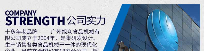 廣州旭眾食品機(jī)械有限公司是一家集科研開(kāi)發(fā),生產(chǎn)設(shè)計(jì),營(yíng)銷服務(wù)為一體的現(xiàn)代化生產(chǎn)企業(yè)?,F(xiàn)代化生產(chǎn)車間,精湛制造技術(shù),所產(chǎn)機(jī)械歷經(jīng)市場(chǎng)重重考驗(yàn),不斷贏得海內(nèi)外客戶的贊譽(yù)。