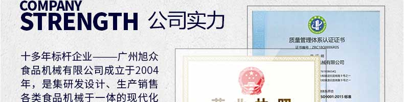 廣州旭眾食品機(jī)械有限公司是一家集科研開發(fā),生產(chǎn)設(shè)計(jì),營銷服務(wù)為一體的現(xiàn)代化生產(chǎn)企業(yè)?,F(xiàn)代化生產(chǎn)車間,精湛制造技術(shù),所產(chǎn)機(jī)械歷經(jīng)市場重重考驗(yàn),不斷贏得海內(nèi)外客戶的贊譽(yù)。