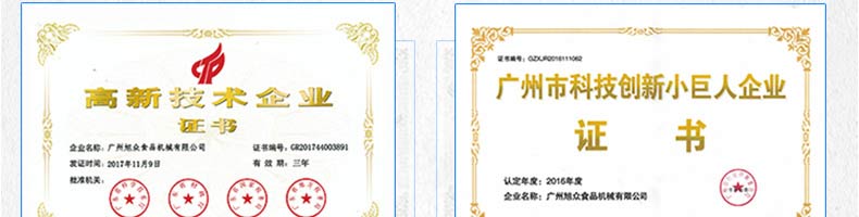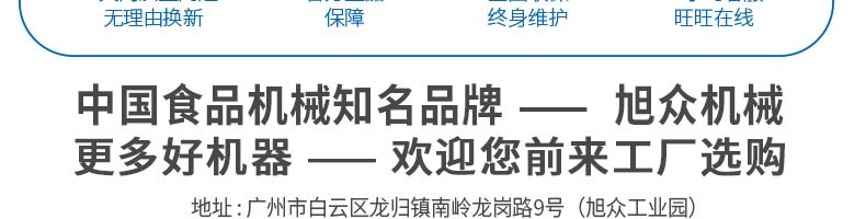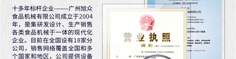 廣州旭眾食品機械有限公司是一家集科研開發(fā),生產(chǎn)設計,營銷服務為一體的現(xiàn)代化生產(chǎn)企業(yè)。現(xiàn)代化生產(chǎn)車間,精湛制造技術,所產(chǎn)機械歷經(jīng)市場重重考驗,不斷贏得海內外客戶的贊譽。