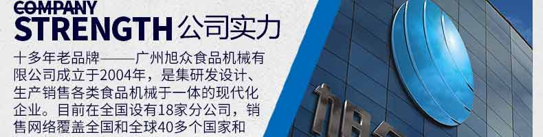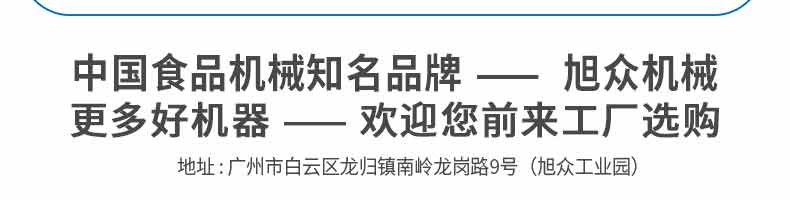 廣州旭眾食品機(jī)械有限公司是一家集科研開發(fā),生產(chǎn)設(shè)計(jì),營銷服務(wù)為一體的現(xiàn)代化生產(chǎn)企業(yè)?,F(xiàn)代化生產(chǎn)車間,精湛制造技術(shù),所產(chǎn)機(jī)械歷經(jīng)市場重重考驗(yàn),不斷贏得海內(nèi)外客戶的贊譽(yù)。