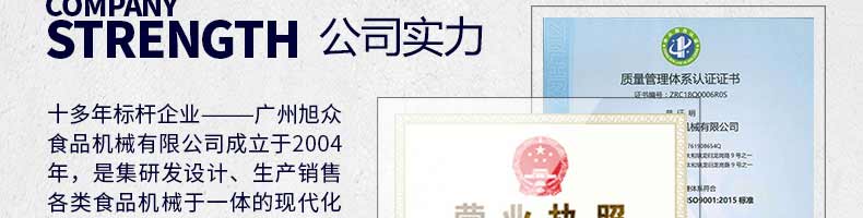 廣州旭眾食品機(jī)械有限公司是一家集科研開(kāi)發(fā),生產(chǎn)設(shè)計(jì),營(yíng)銷(xiāo)服務(wù)為一體的現(xiàn)代化生產(chǎn)企業(yè)?,F(xiàn)代化生產(chǎn)車(chē)間,精湛制造技術(shù),所產(chǎn)機(jī)械歷經(jīng)市場(chǎng)重重考驗(yàn),不斷贏得海內(nèi)外客戶(hù)的贊譽(yù)。