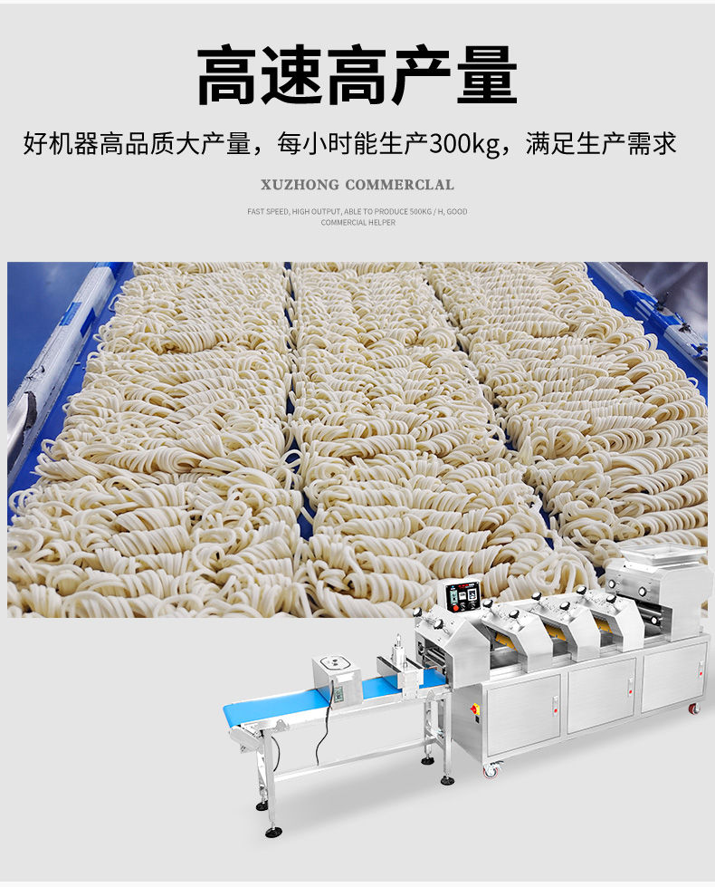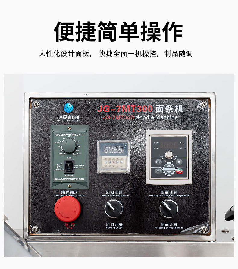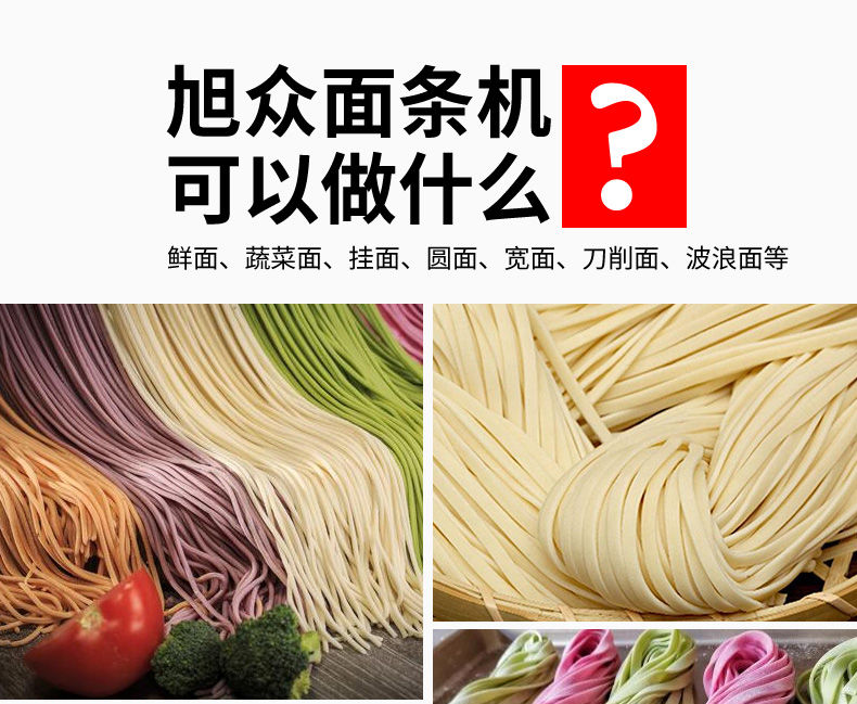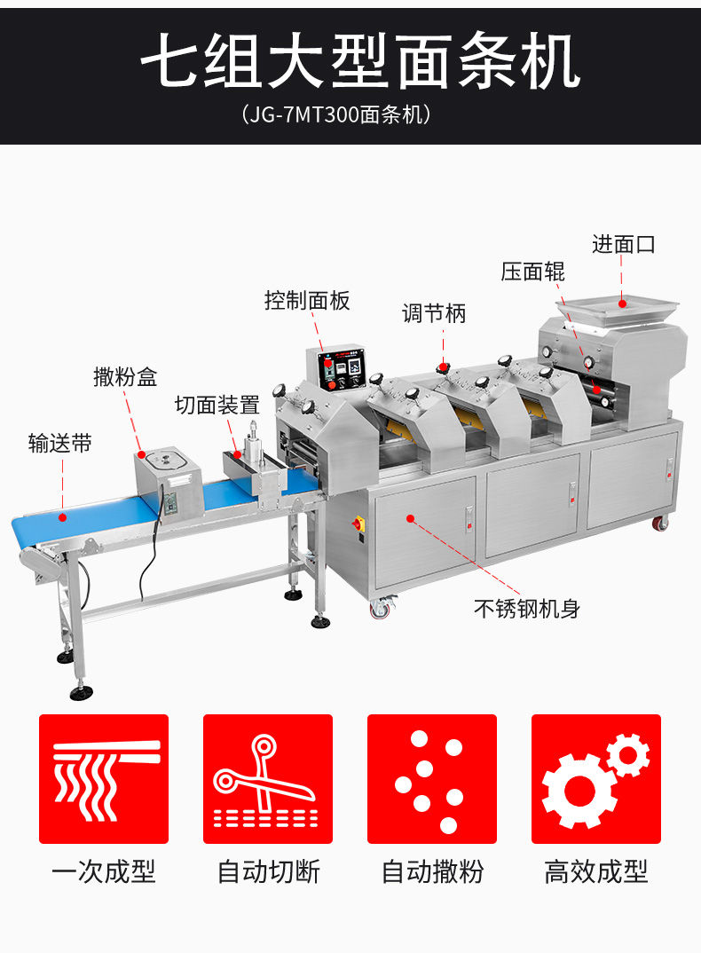 JG-7MT300面條機,多種功能一機搞定比傳統(tǒng)手工做面條,省時省力。可以做什么鮮面、蔬菜面、掛面、圓面、寬面、刀削面、波浪面等。不同的面刀可以做出不同形狀的面食做工細,實用又方便,出面均勻,成型漂亮。